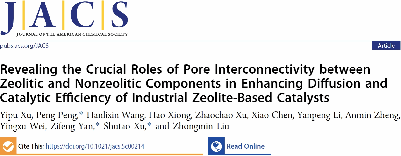 近日,永利集团yl6809永利集团彭鹏团队与中国石油大学(华东)阎子峰、中国科公司大连化学物理研究所刘中民院士/徐舒涛团队合作,在《Journal of the American Chemical Society》期刊发表题为“Revealing the Crucial Roles of Pore Interconnectivity between Zeolitic and Nonzeolitic Components in Enhancing Diffusion and Catalytic Efficiency of Industrial Zeolite-Based Catalysts”的研究论文,中国石油大学(华东)/中科院大连化物所徐亦璞为论文第一作者,永利集团彭鹏、中国石油大学(华东)阎子峰、中科院大连化物所徐舒涛为论文共同通讯作者。